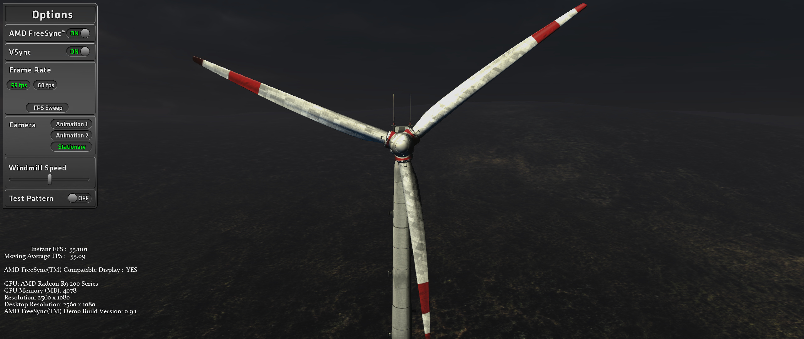 Кроме игр, мы также опробовали и специализированное тестовое приложение компании AMD — Windmill Demo. Это приложение показывает удобную для оценки плавности и качества 3D-сцену с вращающимися лопастями современного ветряка. Также программа позволяет имитировать разную частоту кадров и выбирать режим отображения, включая и выключая вертикальную синхронизацию VSync и динамическую синхронизацию FreeSync.