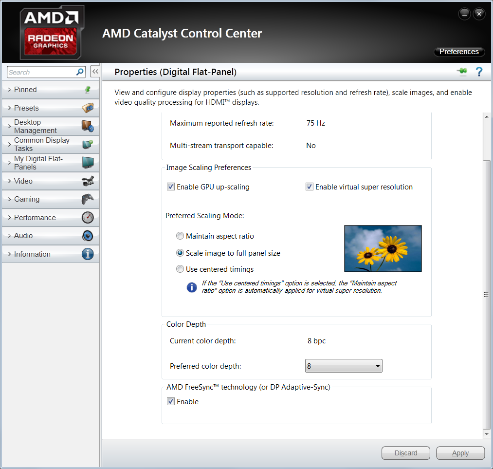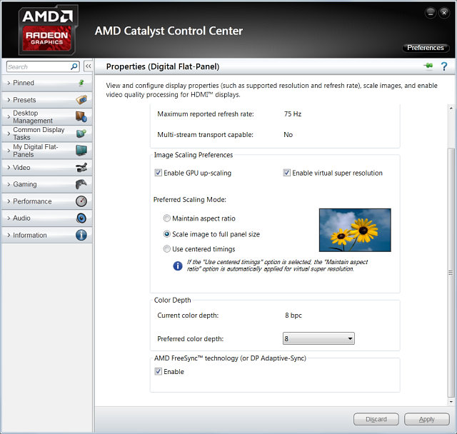 Нажатие на кнопку «Configure» вызовет свойства монитора в панели управления AMD Catalyst Control Center. Прокрутив окно в самый низ — к секции «AMD FreeSync technology (or DP Adaptive-Sync)» можно включить или выключить соответствующую технологию. Для появления этой настройки в панели управления также необходимо, чтобы в настройках экранного меню используемого монитора также была включена поддержка технологии FreeSync.