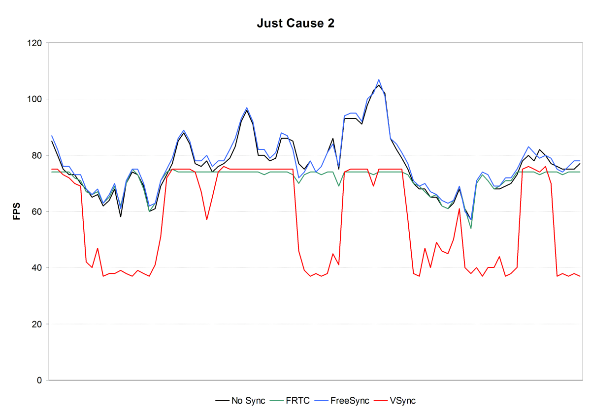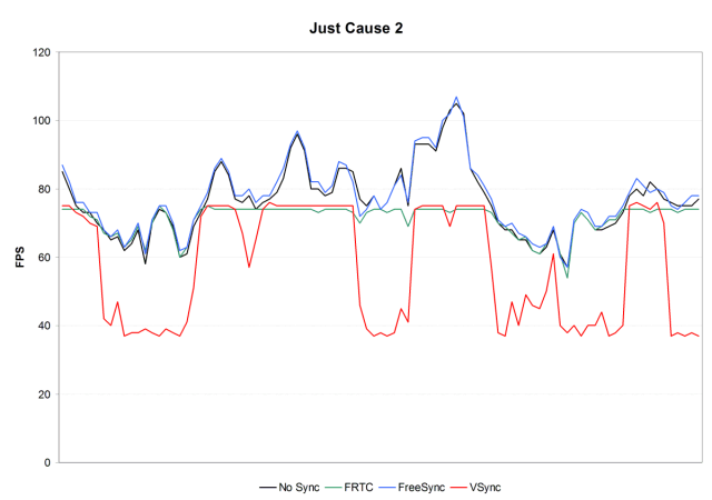 Кстати, в этот раз видно, что технология FRTC работает, ограничивая частоту кадров на значении 75 FPS, как мы и выставляли в настройках. Что ж, среди графиков FPS в этом подразделе нам осталось лишь рассмотреть тестовый отрезок из встроенного бенчмарка игры Just Cause 2 — также довольно старой, но до сих пор достаточно требовательной при максимальных настройках. Тем более, что нас уже интересует другой диапазон FPS.