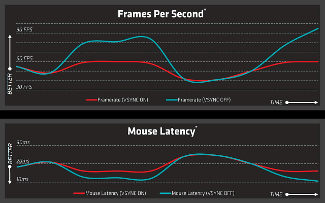 Теперь частота обновления не привязана к старым стандартам и она идеально повторяет время отрисовки кадра графическим процессором. Сравним частоту кадров и задержки управления в игре мышью в режимах с включенными вертикальной синхронизацией (VSync On) и отключенной (VSync Off) — последняя линия будет также соответствовать и работе динамической частоты обновления FreeSync.