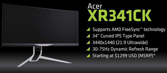 Модель монитора Acer XR341CK интересна тем, что это также IPS-монитор, но размером уже 34 дюйма. А главное — он не просто сверхширокоформатный и с разрешением аж 3440×1440 пикселей, но еще и изогнутый (решение для монитора спорное, но интересное). Эта модель умеет динамически изменять частоту обновления при включенной технологии FreeSync от 30 до 75 Гц.