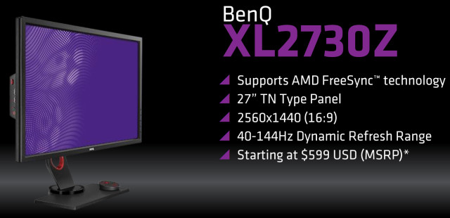 Монитор модели XL2730Z компании BenQ ничем особенным не выделяется, он имеет 27-дюймовую LCD-панель с разрешением 2560×1440 пикселей самого дешевого и быстрого типа TN. Зато именно поэтому он поддерживает адаптивную частоту обновления FreeSync в довольно широких пределах: от 40 до 144 Гц.