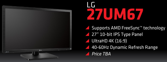 Еще один интересный монитор с поддержкой FreeSync — LG 27UM67. Он поддерживает динамическую частоту обновления в очень узком диапазоне от 40 до 60 Гц, зато имеет 4K-разрешение, а его 27-дюймовая LCD-панель не просто IPS, но еще и поддерживает 10-битный цвет — очень интересное сочетание!