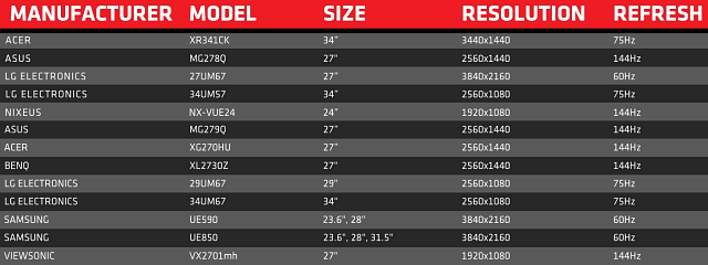 На рынке продается несколько моделей мониторов разных производителей с поддержкой этой технологии: Asus, LG, Acer, BenQ, Samsung, Viewsonic и других. Технология FreeSync получила довольно широкую поддержку со стороны производителей мониторов, первые продукты с поддержкой Adaptive-Sync появились еще в прошлом году, но в по-настоящему широкую продажу они поступили нынешней весной. Приведем некоторые из характеристик лишь для нескольких самых интересных моделей мониторов (в алфавитном порядке):