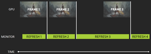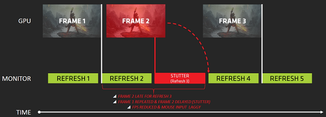 Соответственно, игроки на ПК были ограничены в возможности достижения плавной частоты кадров без ощутимых просадок FPS. Ведь обновление изображения на мониторе строго после каждого кадра возможно только в идеальных условиях, а в реальности получается иначе. GPU далеко не всегда успевает отрисовать кадр до того времени, как его нужно передать на монитор, и если время рендеринга кадра больше времени между обновлениями информации на дисплее, то кадр необходимо или выводить на экран в следующем обновлении изображения на мониторе (если вертикальная синхронизация включена) или выводить изображение, состоящее из кусков нескольких соседних кадров при отключенной синхронизации.