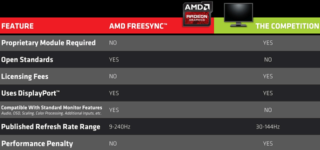 И AMD действительно приводит свои доводы. По их мнению, технология FreeSync лучше G-Sync в том, что она не требует установки недешевого аппаратного модуля стороннего производителя, основывается на открытом общепринятом стандарте VESA, не требует лицензионных отчислений, совместима со стандартными возможностями мониторов (масштабирование, цветокоррекция, дополнительные видеовходы), имеет более широкий рабочий диапазон — в теории от 9 до 240 Гц, в отличие от 30—144 Гц у G-Sync.