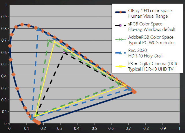 Нынешний контент почти весь создан в рамках стандартов BT.709, sRGB, SMPTE 1886 (Gamma 2.4), а новый стандарт HDR-10, Rec.2020 (BT.2020), SMPTE 2084 способен обеспечить отображение более миллиарда цветов при 10 битах на компонент цвета, что весьма серьезно приближает качество цветопередачи к возможностям человеческого организма по распознаванию цветовых оттенков.