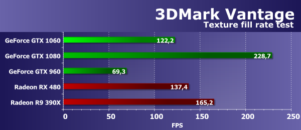 Цифры из второго подтеста 3DMark Vantage показывают производительность блоков ROP, без учета величины пропускной способности видеопамяти (т. н. «эффективный филлрейт»), и тест измеряет именно производительность ROP. Рассматриваемая нами сегодня плата GeForce GTX 1060 отстала от лучшей из плат сравнения на все те же почти 50%. Неудивительно, что GeForce GTX 1080 почти вдвое быстрее, ведь так и должно быть по теории. А вот прямая предшественница GTX 960 более чем в полтора раза медленнее сегодняшней новинки, так что с эффективностью работы блоков ROP в Pascal все нормально.