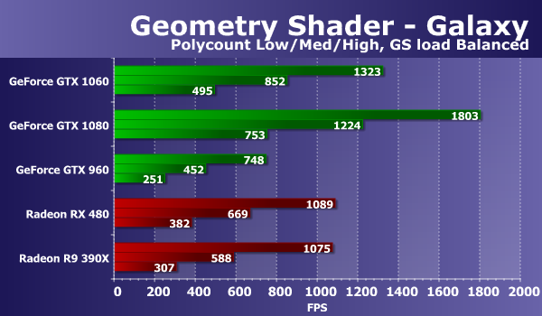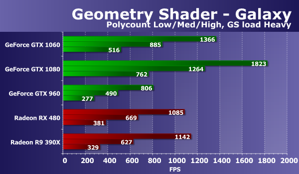 При изменении нагрузки в этом тесте цифры изменились незначительно для плат AMD и для решений Nvidia. И это ничего особенно не меняет. Видеокарты в этом тесте геометрических шейдеров слабо реагируют на изменение параметра GS load, отвечающего за перенос части вычислений в геометрический шейдер, поэтому и наши выводы остаются неизменными. GeForce GTX 1060 в этом подтесте показала отличный результат, обогнав все остальные видеокарты, кроме топовой GTX 1080, от которой она отстала на 25-32%. Отставание свежей Radeon RX 480 от новинки получилось примерно такое же — 25-33%.