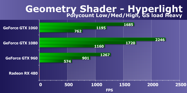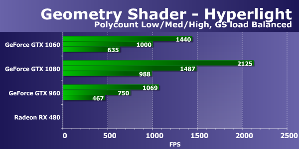Новая модель GeForce GTX 1060 отстает от GTX 1080 лишь на 27-30%, оказавшись до двух раз быстрее аналогичной по позиционированию платы прошлого поколения в виде GeForce GTX 960. Видеокарты Radeon показывают результаты между GTX 960 и новинкой, причем разница между Radeon R9 390X на старом GPU и новой RX 480 совсем невелика. Обе они проиграли GeForce GTX 1060, хоть и не в разы. Посмотрим, как изменится ситуация при переносе части вычислений в геометрический шейдер: