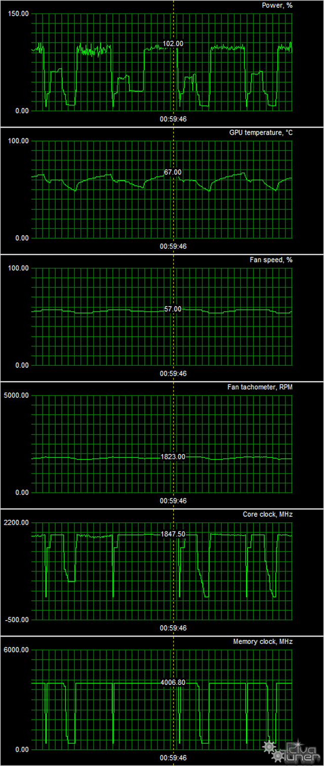 В режиме максимальной нагрузки в 3D температура достигала уровня 67 °C, частота вращения вентилятора поднималась до 1823 оборотов в минуту, шум вырастал до 26,5 дБА.