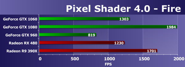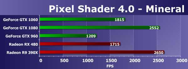 Следующая пара тестов пиксельных шейдеров содержит минимальное количество текстурных выборок для снижения влияния производительности блоков TMU. В них используется большое количество арифметических операций, и измеряют они именно математическую производительность видеочипов, скорость выполнения арифметических инструкций в пиксельном шейдере.