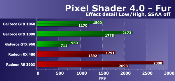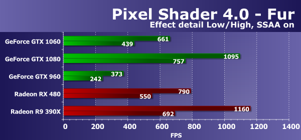 Первым тестом пиксельных шейдеров будет Fur. При самых низких настройках в нем используется от 15 до 30 текстурных выборок из карты высот и две выборки из основной текстуры. Режим Effect detail — «High» увеличивает количество выборок до 40—80, включение «шейдерного» суперсэмплинга — до 60—120 выборок, а режим «High» совместно с SSAA отличается максимальной «тяжестью» — от 160 до 320 выборок из карты высот.