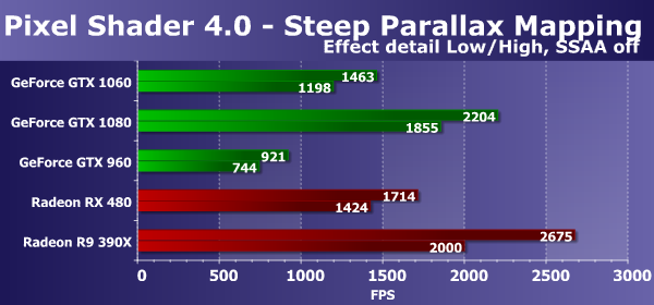 Ну а если сравнивать скорость заполнения сцены новой видеокартой GeForce GTX 1060 с решениями компании AMD, то рассматриваемая нами сегодня плата в этом тесте снова показала чуть меньшую скорость заполнения сцены по сравнению с Radeon RX 480 (разница составила всего 6%). Ну а R9 390X очень сильно отстал от обеих современных видеокарт. Судя по всему, на результате сказалось не только большое количество блоков ROP, но и эффективные оптимизации по сжатию данных у современных GPU обоих производителей.