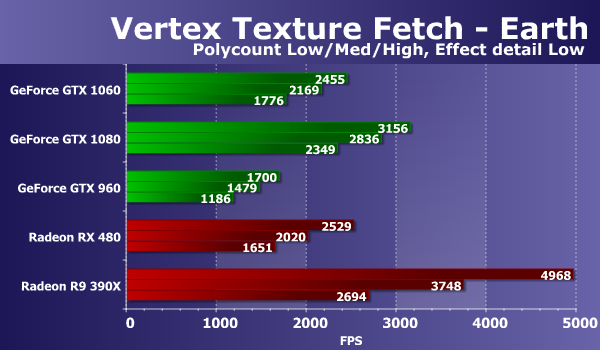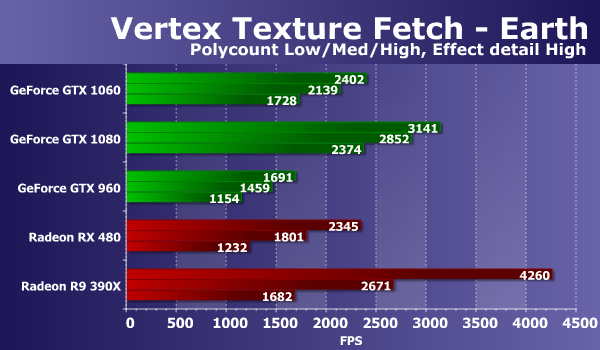 В тестах «Vertex Texture Fetch» измеряется скорость большого количества текстурных выборок из вершинного шейдера. Тесты схожи, по сути, так что соотношение между результатами карт в тестах «Earth» и «Waves» должно быть примерно одинаковым. В обоих тестах используется displacement mapping на основании данных текстурных выборок, единственное существенное отличие состоит в том, что в тесте «Waves» используются условные переходы, а в «Earth» — нет.