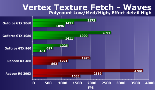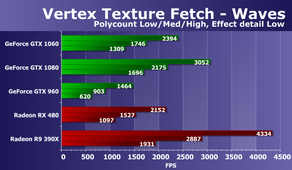Результаты во втором тесте вершинного текстурирования «Waves» во многом похожи на то, что мы видели на предыдущих диаграммах. Скоростные показатели GeForce GTX 1060 в этом тесте явно выше производительности Radeon RX 480, хотя старенькая Radeon R9 390X оказалась быстрее их всех, и даже GTX 1080 обогнала. Если сравнивать новое решение Nvidia с GeForce, то GTX 960 отстал вдвое, а топовая GTX 1080 оказалась лишь на 20-22% быстрее. Рассмотрим второй вариант этой же задачи: