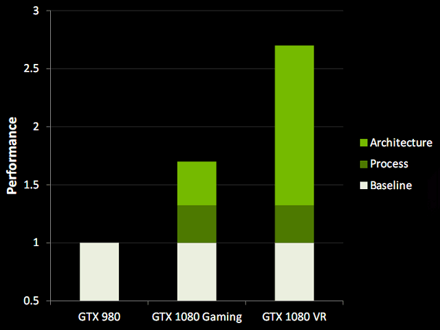 Такой подход способен прилично экономить в производительности. Так, типичное изображение для Oculus Rift на каждый глаз составляет 1,1 мегапиксель. Но из-за разницы в проекциях, чтобы его отрендерить, используется исходное изображение в 2,1 мегапикселя — на 86% больше необходимого! Применение мультипроецирования, внедренного в архитектуру Pascal, позволяет снизить разрешение отрисовываемого изображения до 1,4 мегапикселей, получив полуторакратную экономию в скорости пиксельной обработки, а также экономит пропускную способность памяти.