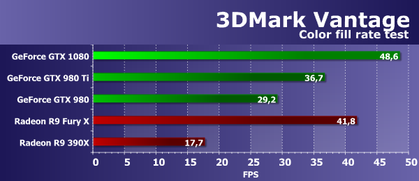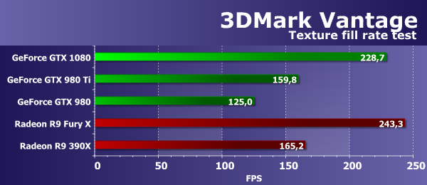 Что касается сравнения скорости текстурирования новой топовой видеоплаты от Nvidia с имеющимися на рынке решениями конкурента, то новинка все же уступает видеокарте верхнего ценового диапазона R9 Fury X, имеющей очень много блоков TMU, а вот R9 390X отстал от них обеих. Результаты этого теста показывают, что видеокарты компании AMD с текстурированием справляются весьма неплохо, но с выпуском GTX 1080 конкурент подобрался к лучшей из них совсем близко.