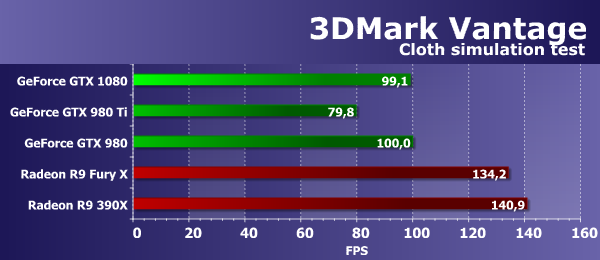 А вот во втором «геометрическом» тесте из 3DMark Vantage ситуация изменилась. В этот раз новая GeForce уже показывает максимальные результаты, обогнав как платы соперника, так и решения архитектуры Maxwell. Новая одночиповая плата GeForce GTX 1080 в этот раза стала лидером сравнения, более чем на 20% опередив топовую плату предыдущего поколения GTX 980 Ti, а предшественницу и вовсе на 37%.