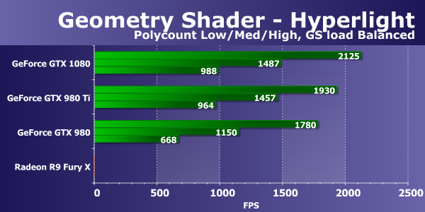 Новая модель GeForce GTX 1080 почти не отстает от GTX 980 Ti в простых условиях, обгоняя топовую плату прошлого поколения в сложных на 11%, ну а GeForce GTX 980 заметно отстает от обеих. Видеокарты Radeon показывают сильно худшие результаты, Radeon R9 390X на старом GPU стала аутсайдером, да и Fury X почти вдвое проигрывает новинке от Nvidia. Посмотрим, как изменится ситуация при переносе части вычислений в геометрический шейдер: