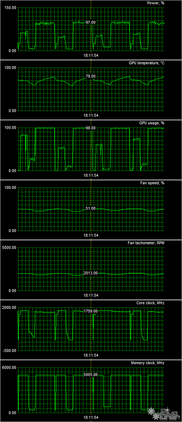 В режиме максимальной нагрузки в 3D температура достигала уровня 79 °C, частота вращения вентилятора поднималась до 2013 оборотов в минуту, шум вырастал до 27,5 дБА.