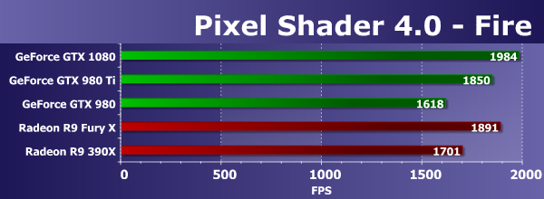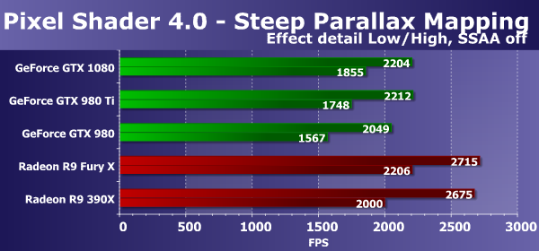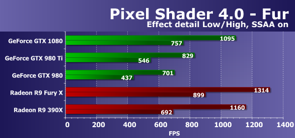 И в нашем сегодняшнем сравнении такие условия полностью изменили соотношение сил. Мы раньше писали, что графические решения AMD Radeon и в этом D3D10-тесте пиксельных шейдеров работают эффективнее конкурирующих плат GeForce, но именно новая модель GeForce GTX 1080, основанная на первом чипе архитектуры Pascal смогла показать результат на уровне Radeon R9 Fury X во всех условиях. А уж устаревшее решение конкурента и вовсе осталось позади. По сравнению с решениями Nvidia прошлого поколения, новинка показала скорость на четверть быстрее GeForce GTX 980 Ti и обогнала GTX 980 в полтора раза — похоже, что примерно такой и будет реальная разница между решениями Nvidia в игровых приложениях.