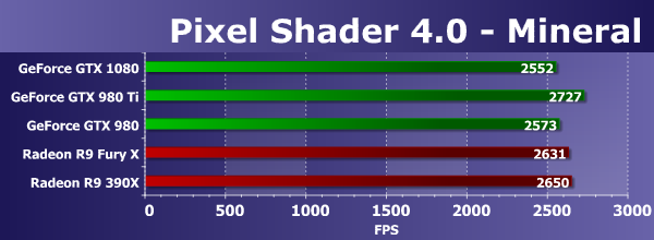 Следующая пара тестов пиксельных шейдеров содержит минимальное количество текстурных выборок для снижения влияния производительности блоков TMU. В них используется большое количество арифметических операций, и измеряют они именно математическую производительность видеочипов, скорость выполнения арифметических инструкций в пиксельном шейдере.