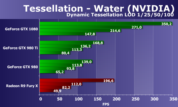 Мы тестируем все видеоплаты при четырех разных коэффициентах тесселяции — в данном случае настройка называется Dynamic Tessellation LOD. При первом коэффициенте разбиения треугольников, скорость не ограничена производительностью геометрических блоков, поэтому топовая видеокарта Radeon показывает довольно высокий результат, близкий к показателям GeForce GTX 980 Ti. Но уже на следующих ступенях геометрической нагрузки производительность платы Radeon снижается, и все решения Nvidia выходят вперед.