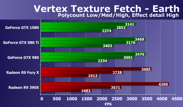 В тестах «Vertex Texture Fetch» измеряется скорость большого количества текстурных выборок из вершинного шейдера. Тесты схожи, по сути, так что соотношение между результатами карт в тестах «Earth» и «Waves» должно быть примерно одинаковым. В обоих тестах используется displacement mapping на основании данных текстурных выборок, единственное существенное отличие состоит в том, что в тесте «Waves» используются условные переходы, а в «Earth» — нет.