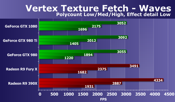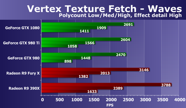 Результаты во втором тесте вершинного текстурирования «Waves» во многом похожи на то, что мы видели на предыдущих диаграммах. Скоростные показатели всех GeForce в этом тесте ниже производительности решений конкурента, и все же новая модель GeForce GTX 1080 показывает скорость на уровне нынешнего топового решения конкурента Radeon R9 Fury X. Впрочем, R9 390X оказался быстрее их обоих. Зато новинка стала лучшей среди трех рассмотренных GeForce, в тяжелом режиме обогнав GTX 980 Ti аж на 21%. Рассмотрим второй вариант этой же задачи: