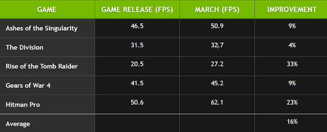 Утилита имеет возможность классифицировать крэши GPU по месту и типу и даже может быть встроена в релиз игры — чтобы игроки помогали отладке при бета-тестировании, к примеру. Nvidia сотрудничает с Microsoft и в вопросе стандартизации функциональности этой утилиты. Все эти утилиты вместе с улучшениями в драйверах помогают делать качественные DX12-движки и игры. Например, Nvidia приводит такие цифры среднего улучшения производительности в играх с момента их релиза: