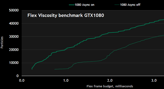 Применение асинхронных вычислений имеет весьма большое значение в этих задачах. В частности, тест производительности, основанный на коде FleX, запущенный на GeForce GTX 1080, показывает преимущество по затратам времени на вычисления вплоть до двукратного (в зависимости от количества рассчитываемых частиц), по сравнению с обычной версией, не использующей асинхронные вычисления.