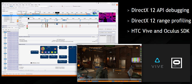 Именно поэтому Nvidia обратила особое внимание на удобные утилиты для DirectX 12, включая PIX для Windows, Nvidia Aftermath и новую версию nSight Visual Studio Edition. Последний инструмент, обновленный до версии 5.3, позволяет отлавливать ошибки в DX12-приложениях, профилировать их и имеет поддержку HTC Vive и Oculus SDK, что важно при разработке приложений виртуальной реальности.