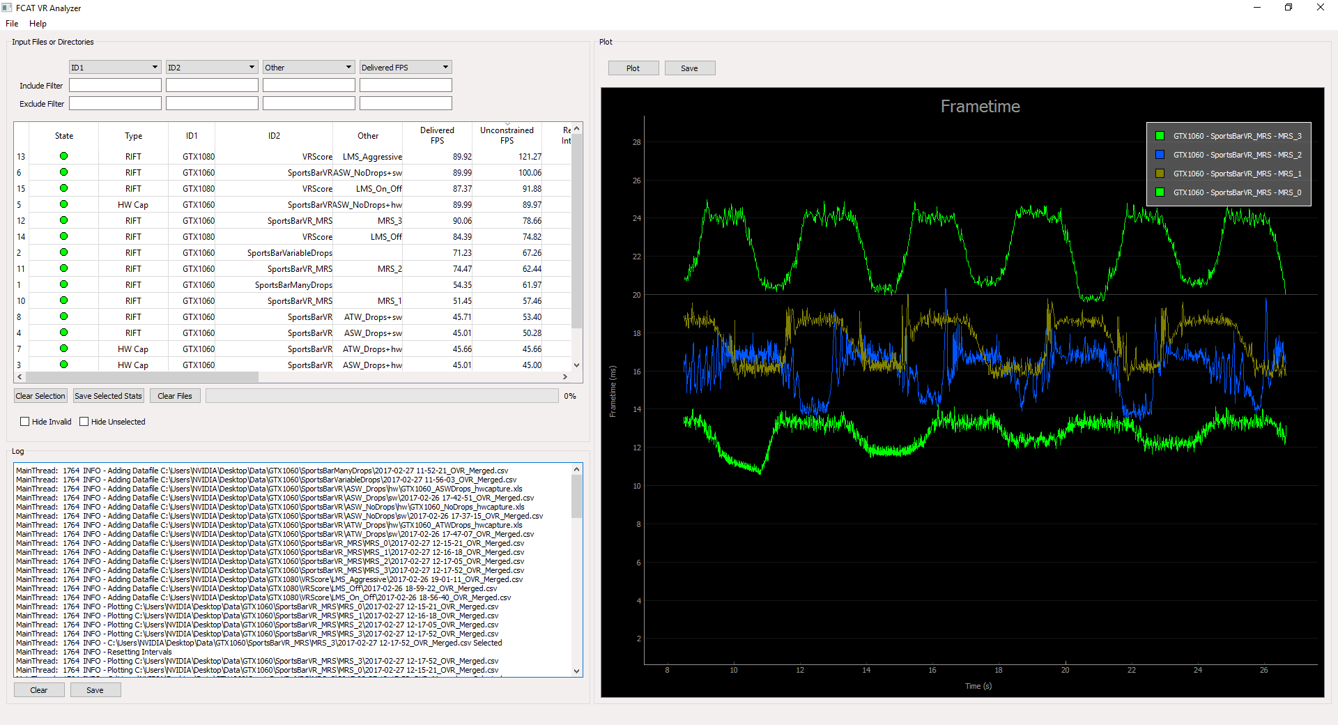 Но так как сами по себе CSV-файлы не очень удобны, для анализа массива данных требуются специальные инструменты. Nvidia выпустила утилиту для анализа и визуализации результатов FCAT Data Analyzer, которая входит в комплект FCAT VR и позволяет сравнивать различные решения в удобном виде при отличающихся условиях рендеринга в приложениях виртуальной реальности.