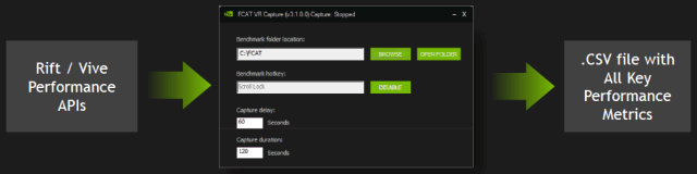 Например, продвинутое программное обеспечение виртуальной реальности может выводить пропущенные при рендеринге кадры два раза подряд или экстраполировать промежуточные кадры, что явно нельзя назвать комфортным игровым процессом и что уж точно не подходит для измерения производительности, ведь технически будут выводиться 90 кадров в секунду, но практически то далеко не все они уникальны и отрендерены на GPU. Для того, чтобы исправить это досадное недоразумение, Nvidia решила выпустить новый пакет для анализа производительности в приложениях виртуальной реальности — FCAT VR, предназначенный для помощи разработчикам, игровым энтузиастам и специализированной прессе.
