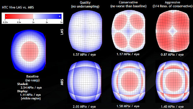 При отображении всего 1,11 мегапикселей на каждый глаз, GPU приходится обрабатывать 2,54 мегапикселей — это более чем вдвое превышает необходимый объем работы. При помощи технологий LMS и MRS можно нивелировать подобный перекос, обрабатывая больше пикселей в центре кадра и заметно меньше по его краям. Применение MRS позволяет снизить количество затеняемых пикселей с 2,54 до 2,03 мегапикселей, получив почти идеальное изображение. Или можно немного снизить качество, обрабатывая лишь 1,40-1,58 мегапикселей на каждый глаз. Еще более продвинутая технология LMS позволяет получить близкое к идеалу VR-изображение при обработке 1,57 мегапикселей или приемлемое при 1,17 мегапикселях — вдвое меньше, чем без оптимизаций! Это в теории, а вот что получается на практике: