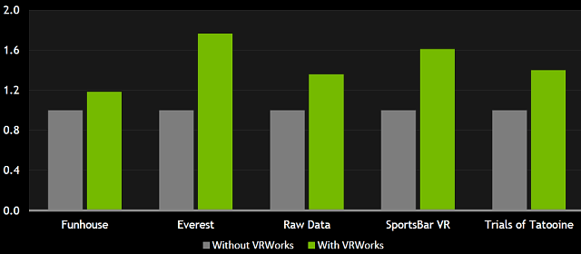 Инициатива компании VRWorks позволяет разработчикам использовать все новые возможности современных графических процессоров Nvidia. Так, им предлагается применять технологии Multi-Res Shading и Lens Matched Shading, предназначенные для повышения производительности рендеринга в виртуальном пространстве и улучшения его качества. Эти технологии снижают количество работы при рендеринге без видимого снижения качества. Если их не использовать, то в центре VR-изображения для каждого глаза GPU будет обрабатывать меньше пикселей, чем необходимо, а на периферии — наоборот, большое количество уже обработанных пикселей отбрасывается и не учитывается.