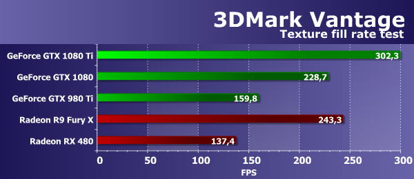 Что касается сравнения скорости текстурирования новой топовой видеоплаты от Nvidia с хоть и не конкурирующими с ней, но лучшими из имеющихся на рынке решениями конкурента, то новинка опередила обе видеокарты AMD, в том числе решение верхнего ценового диапазона R9 Fury X, имеющее немало блоков TMU. Результаты теста показывают, что видеокарты компании AMD с текстурированием справляются неплохо, но с выпуском более мощных моделей графических процессоров, компания Nvidia отобрала у них номинальное лидерство — именно GTX 1080 Ti и стала лучшей по скорости текстурирования.