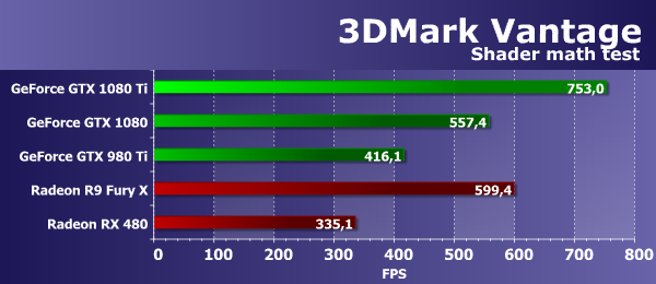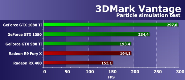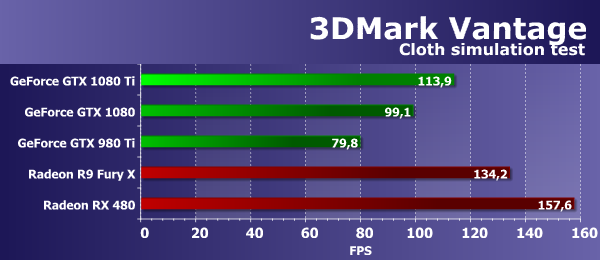 В данном случае, важны и математическая и текстурная производительность, и в этой «синтетике» из 3DMark Vantage новая плата GeForce GTX 1080 Ti показала отличный результат, оказавшись на 29% быстрее младшей модели текущего поколения Pascal, что полностью соответствует теории. Топовая игровая модель предыдущего поколения, основанная на графическом процессоре архитектуры Maxwell, проиграла почти в два раза. Ну и понятно, что новая плата от Nvidia показала в этом тесте результат на 45% лучше, чем R9 Fury X, и оказалась более чем вдвое быстрее RX 480 — платы Radeon ей явно не конкуренты.