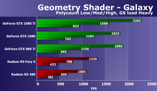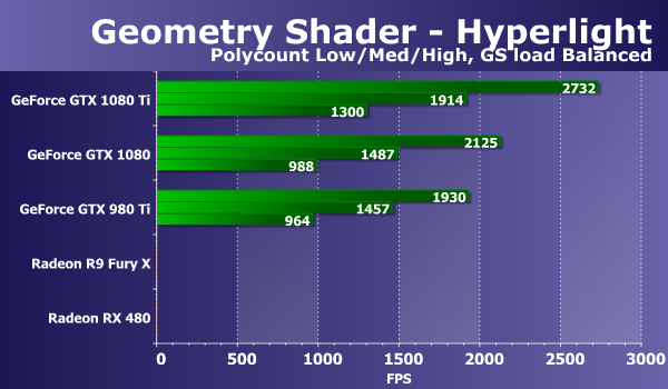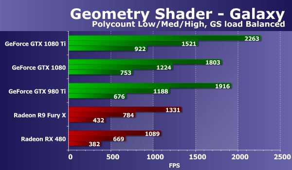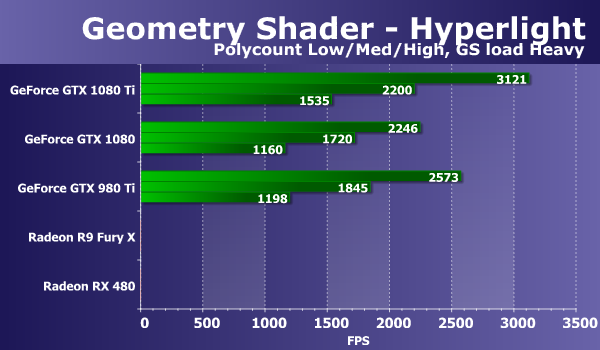 Новая модель GeForce GTX 1080 Ti обогнала свою младшую сестру GTX 1080 на основе GP104 во всех условиях примерно на 22-26%, а предшествующую ей топовую плату прошлого поколения GTX 980 Ti обошла еще с большим запасом. Видеокарты Radeon в этом тесте показывают результаты заметно хуже, Radeon RX 480 на самом новом GPU компании AMD стал аутсайдером, да и Fury X проигрывает новинке более чем вдвое. Посмотрим, как изменится ситуация при переносе части вычислений в геометрический шейдер: