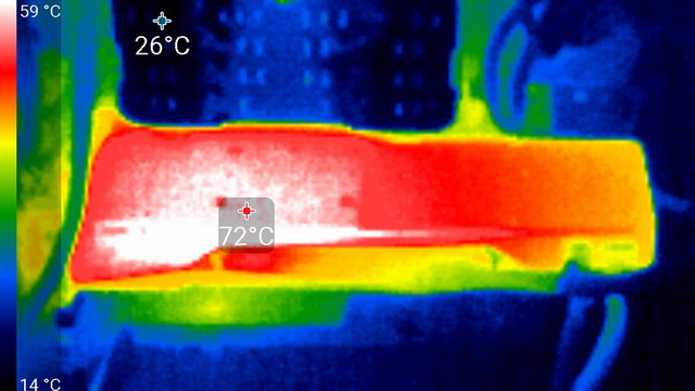 Максимальный нагрев 78 градусов — на печатной плате с края под пластиной с обратной стороны. На фотографии получилось меньше, так как снято с большего расстояния.