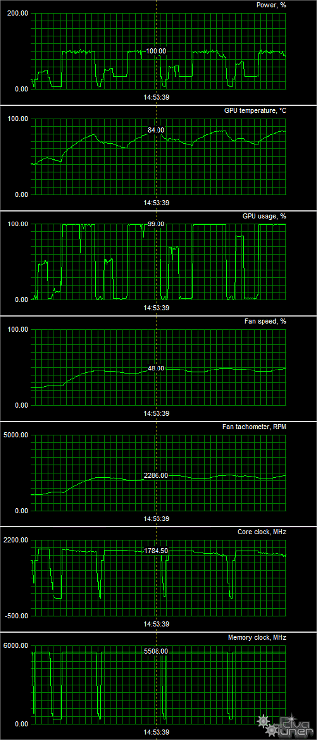 После 6-часового прогона под нагрузкой максимальная температура GPU не превысила 84 градусов, что