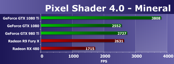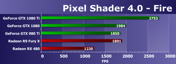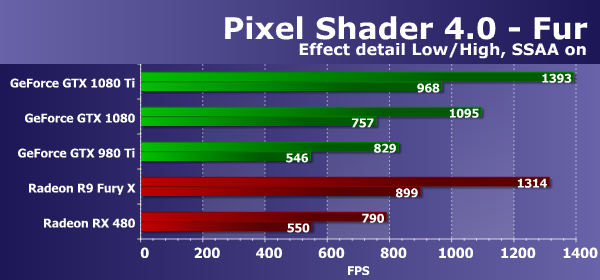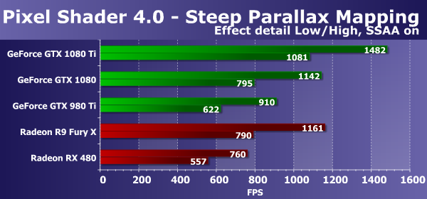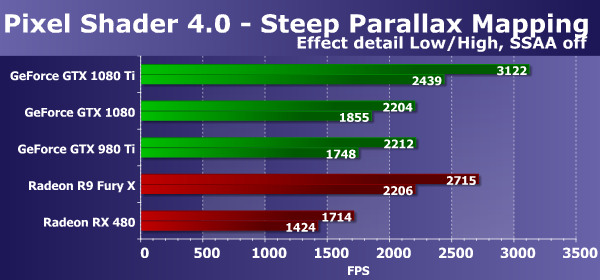 В наших сравнениях подобные условия обычно весьма существенно меняют соотношение сил. Так получилось и в этот раз. Хотя графические решения AMD Radeon и в этом D3D10-тесте пиксельных шейдеров также работают несколько эффективнее конкурирующих плат GeForce, но новые видеокарты, основанные на чипах архитектуры Pascal, смогли показать достойные результаты. Так, новая модель GTX 1080 Ti значительно опередила Radeon R9 Fury X во всех условиях, хотя в самых простых была к ней куда ближе. По сравнению с другими решениями Nvidia, новинка показала скорость на те же 30-36% быстрее GeForce GTX 1080 и обогнала GTX 980 Ti более чем в полтора раза.
