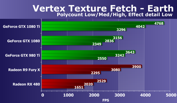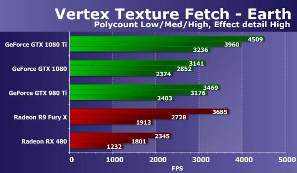 В тестах «Vertex Texture Fetch» измеряется скорость большого количества текстурных выборок из вершинного шейдера. Тесты схожи, по сути, так что соотношение между результатами карт в тестах «Earth» и «Waves» должно быть примерно одинаковым. В обоих тестах используется displacement mapping на основании данных текстурных выборок, единственное существенное отличие состоит в том, что в тесте «Waves» используются условные переходы, а в «Earth» — нет.