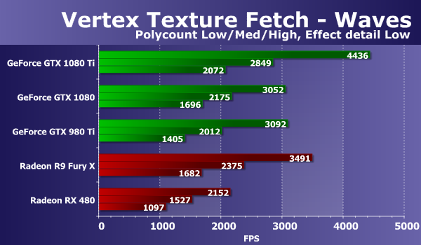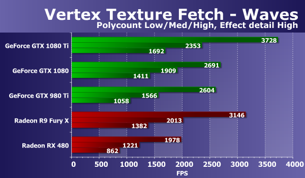 Результаты во втором тесте вершинного текстурирования «Waves» в целом похожи на то, что мы видели на предыдущих диаграммах, но скоростные показатели всех GeForce в этом тесте чуть ниже. Впрочем, производительности новой модели GeForce GTX 1080 Ti хватает для того, чтобы показывает результат лучше всех. Даже номинальное топовое решение конкурента Radeon R9 Fury X явно отстает, хоть и не в разы. Естественно, что новинка стала лучшей среди трех рассмотренных GeForce, в тяжелом режиме обогнав GTX 1080 на 45%, а в легком — лишь на 22%, так как GTX 1080 явно ограничена ПСП. Рассмотрим второй вариант этой же задачи:
