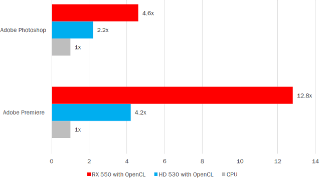 На следующей диаграмме показано относительное ускорение на системе с установленной видеокартой Radeon RX 550, которая ускоряет некоторые из типичных операций в приложениях пакета Adobe Creative Cloud, по сравнению с функциями, выполняемыми исключительно на CPU и при использовании возможностей встроенного видеоядра. В состав бенчмарка Adobe Photoshop CC вошли такие операции как изменение размера изображения, его поворот и несколько фильтров (Crystallize, Gaussian Blur и Smart Sharpen), а в тест Adobe Premiere CC вошли операции движения, отражения, изменения прозрачности, а также фильтров Lens Distortion и Gaussian Blur.