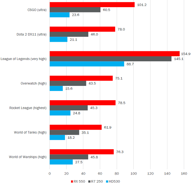 Также в своих оценках AMD уделяет много внимания тому, что новая модель Radeon RX 550 отлично подходит для киберспортивных развлечений, в которые играют сотни миллионов пользователей по всему миру. Следующая сводная диаграмма показывает производительность новинки в нескольких таких игровых проектах, по сравнению с все тем же Radeon R7 250 и интегрированным видеоядром Intel HD Graphics 530: