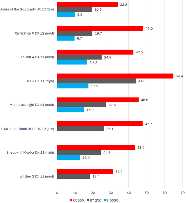 Сравнение также проводилось в разрешении 1920×1080 пикселей с решением одного из предыдущих поколений в виде Radeon R7 250 этого же класса, а также интегрированного видеоядра Intel. Если оно было способно на это, так как в паре игр Intel HD Graphics 530 просто оказался не способен запустить эти проекты, как минимум — при выбранных настройках. В то время как новинка вполне способна обеспечить приемлемую скорость рендеринга даже в современных проектах при среднем (иногда низком, но иногда и высоком) качестве графики — чаще всего достигалась частота кадров от 30 до 50 FPS, что вполне комфортно для большинства однопользовательских игр.