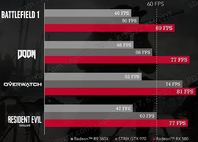 Как видите, если видеокарты Radeon R9 380X и GeForce GTX 970 зачастую не способны показать в таких условиях требуемые для комфорта и плавности 60 FPS, то новая модель Radeon RX 580 с легкостью позволяет получить производительность в 69-81 FPS в представленных в сравнении играх. В среднем, по оценке компании AMD, новинка обладает мощностью в 1,6 раза выше, чем Radeon R9 380X, если говорить об игровой производительности.