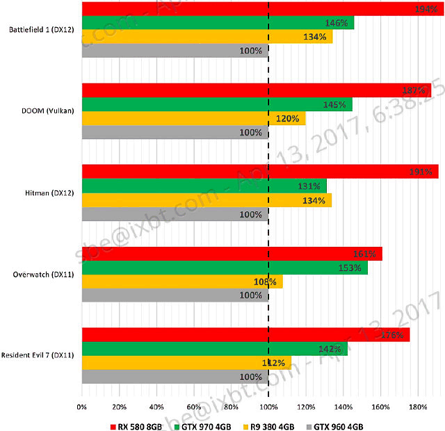 Получается, что Radeon RX 580 действительно выглядит хорошим вариантом для апгрейда видеосистем уровня GeForce GTX 960 и Radeon R9 380 — производительность в некоторых случаях может почти удвоиться. И даже если сравнивать новинку с GeForce GTX 970, которая до сих пор неплоха в играх, то Radeon RX 580 имеет явное преимущество в играх, применяющих современные графические API: DirectX 12 и Vulkan. А с учетом наличия 8 ГБ видеопамяти у новой модели AMD ее преимущество в будущем лишь усугубится.